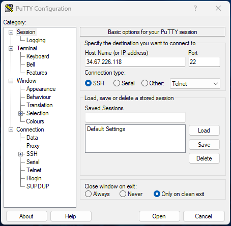 Para começar, vamos abrir a ferramenta PuTTY. Digite ou cole na caixa Host Name (or Ip address), o IP externo da instância desejada: