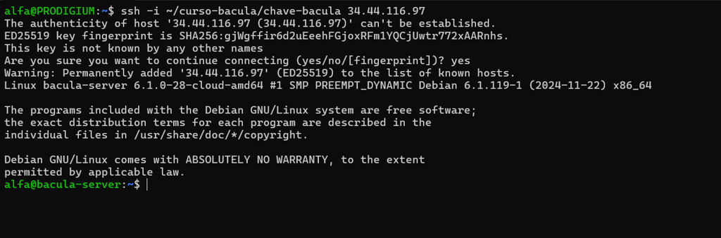 Ao ser perguntado se gostaria de continuar com o acesso digite “yes” e pressione ENTER. Se o comando não for executado da pasta onde está localizada a chave privada, cuja chave pública foi adicionada ao GCP anteriormente, informe o endereço completo do local onde ela se encontra. O retorno será semelhante a este: