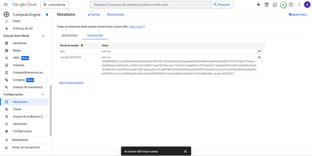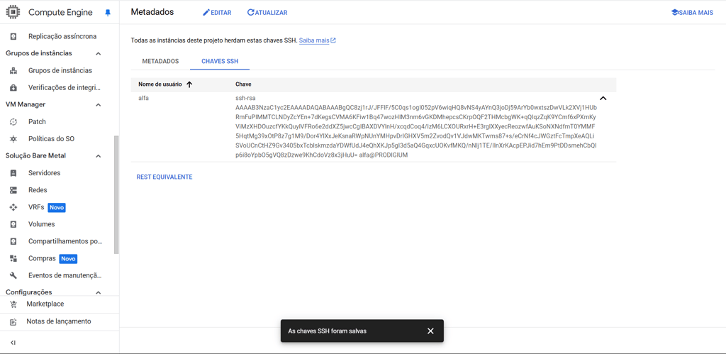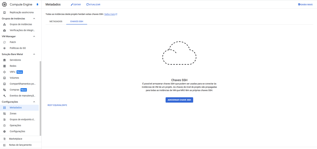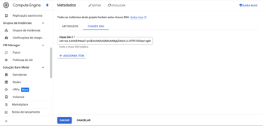Seguindo os mesmos da seção “Adicionando chaves SSH no GCP”, retorne ao painel do GCP e realize as seguintes ações:
