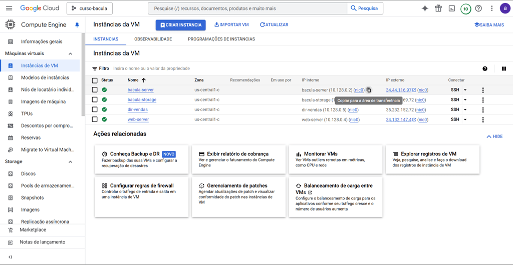 Antes de realizar o acesso SSH copie o endereço IP público da instância, no painel do GCP, em Compute Engine > Instâncias de VM na coluna IP externo: