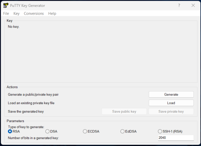 Com o PuTTY instalado abra a ferramenta PuTTYgen e clique no botão Generate: