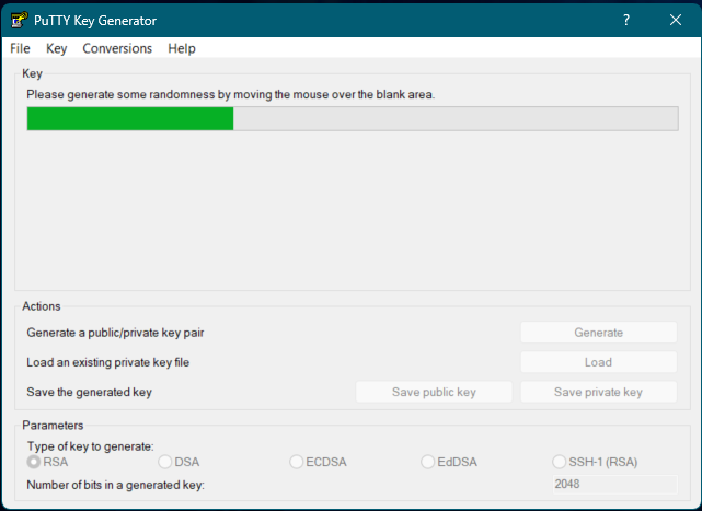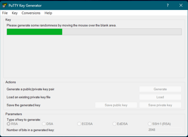 Mova o mouse várias vezes na área branca da tela para que a ferramenta gere o par de chaves SSH: