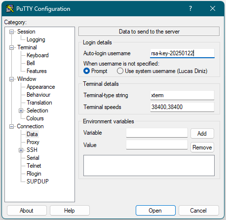 Em seguida, clique em Connection > Data e na caixa Auto-login username digite o nome do usuário que apareceu no painel da GCP, quando você colou a chave pública: