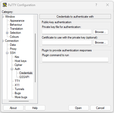 Para concluir a configuração, expanda o menu SSH, em seguida expanda também o submenu Auth. Clique em Credentials e busque a chave privada criada anteriormente em Private key file for authentication através do botão Browse...: