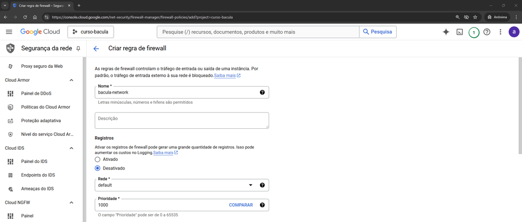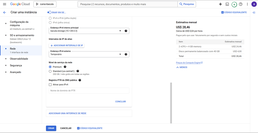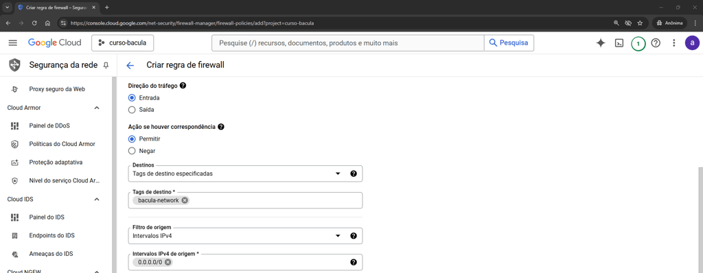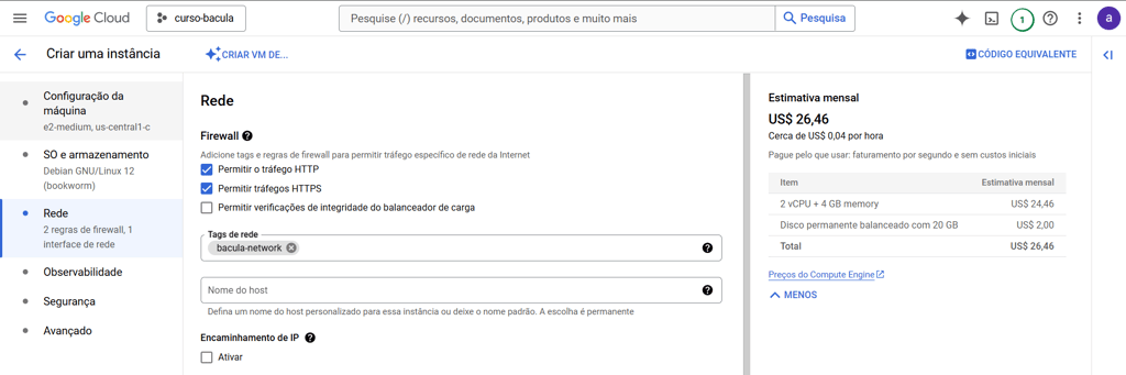 Para definir os parâmetros de rede da VM clique no menu lateral “Rede”. No item Firewall libere o acesso nas portas 80 e 443, selecionando “Permitir tráfego HTTP” e “Permitir tráfegos HTTPS”. No campo “Tags de rede”, digite bacula-network: