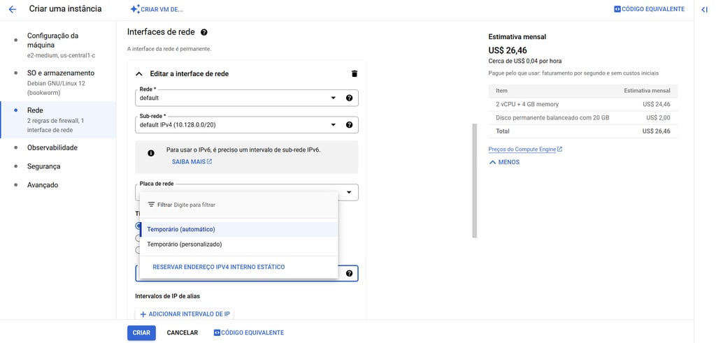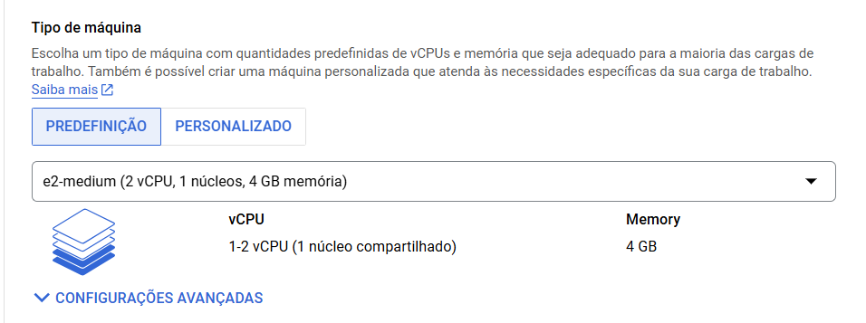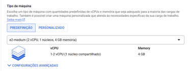 Em “Tipo de máquina”, selecione o tipo "e2-medium (2 vCPU, 1 núcleo, 4 GB de memória)":