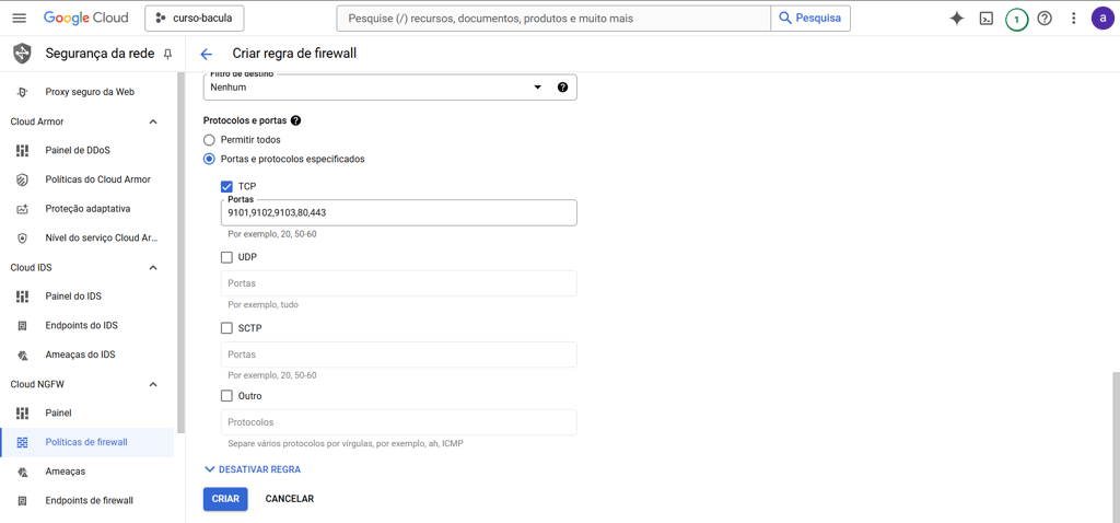 Em Protocolos e portas marque “Portas e protocolos especificados” e selecionando a opção “TCP” defina as portas 9101, 9102, 9103, 80 e 443, as quais serão utilizadas pelo Bacula, seguindo o exemplo que estamos abordando em nosso artigo. Caso sejam disponibilizados outros serviços, libere as respectivas portas que serão configuradas em seu laboratório. Utilize vírgulas para separar as portas informadas. Para finalizar a configuração, clique no botão “CRIAR”: