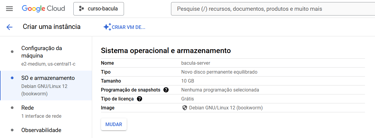 Para otimizar o processo de criação das máquinas do nosso laboratório podemos utilizar o mesmo modelo de VM que criamos anteriormente. Na lista de Instâncias de VM clique no nome da VM bacula-server, onde irá exibir a página de detalhes da instância, após clique no link “CRIAR SEMELHANTE” para criar uma nova instância aproveitando algumas configurações.