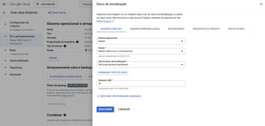 Altere o tamanho do disco para 20GB no campo “Tamanho (GB)”. Note que iremos manter o sistema operacional Debian e sua versão 12 Bookworm, bem como o tipo de disco de inicialização (Disco permanentemente equilibrado). Após finalizar os ajustes, clique em “SELECIONAR”: