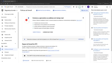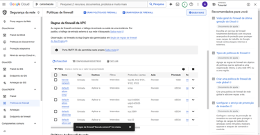 No menu lateral da página Rede VPC clique em “Firewall” e na página de “Segurançade rede” clique na opção “CRIAR REGRA DE FIREWALL”: